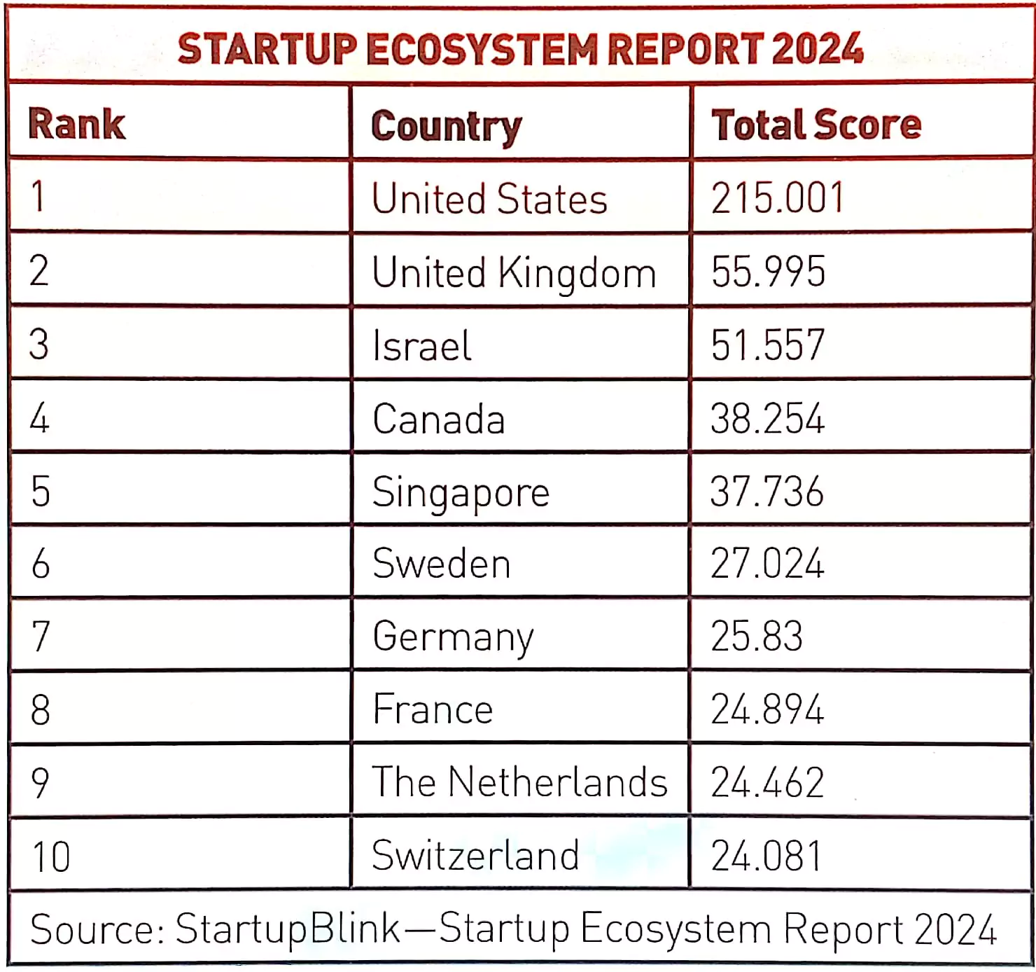 - Switzerland has re-entered the top 10 , reinforcing Europe’s strength and diversity in startup ecosystems.