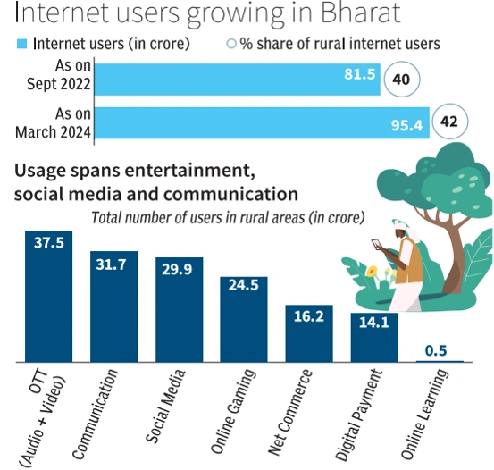 - Online learning: Only 5 crore rural users, indicating a digital divide in