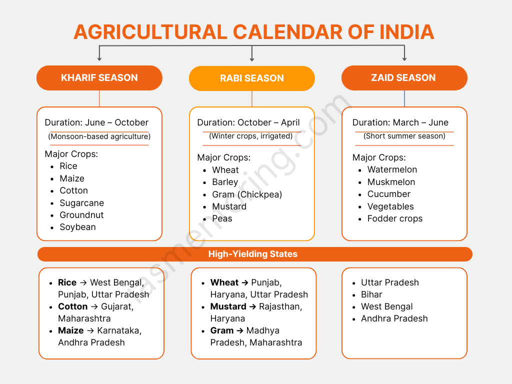 Rice dominates the kharif season, requiring field preparation by May–June.