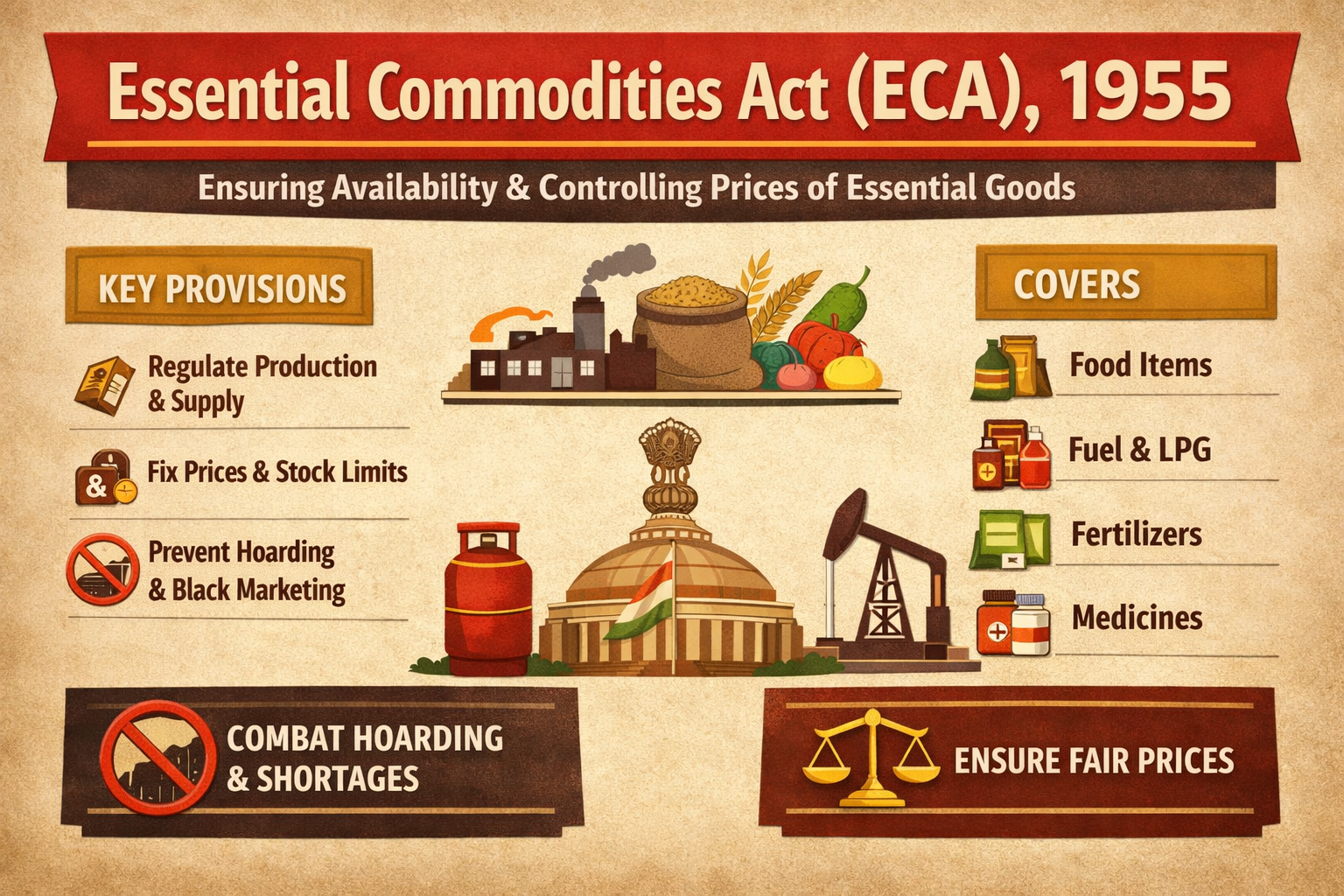 Explore how the Essential Commodities Act (ECA), 1955 influences market fluctuations, controls prices, ensures supply stability, and impacts LPG, oil, and food sectors amid India’s ongoing energy crisis.